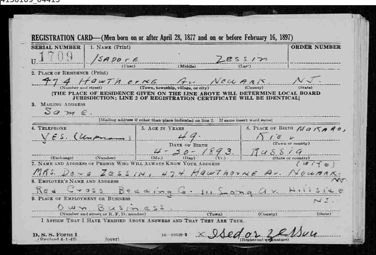 Draft Cards des Selective Service System von eingewanderten Zessin's